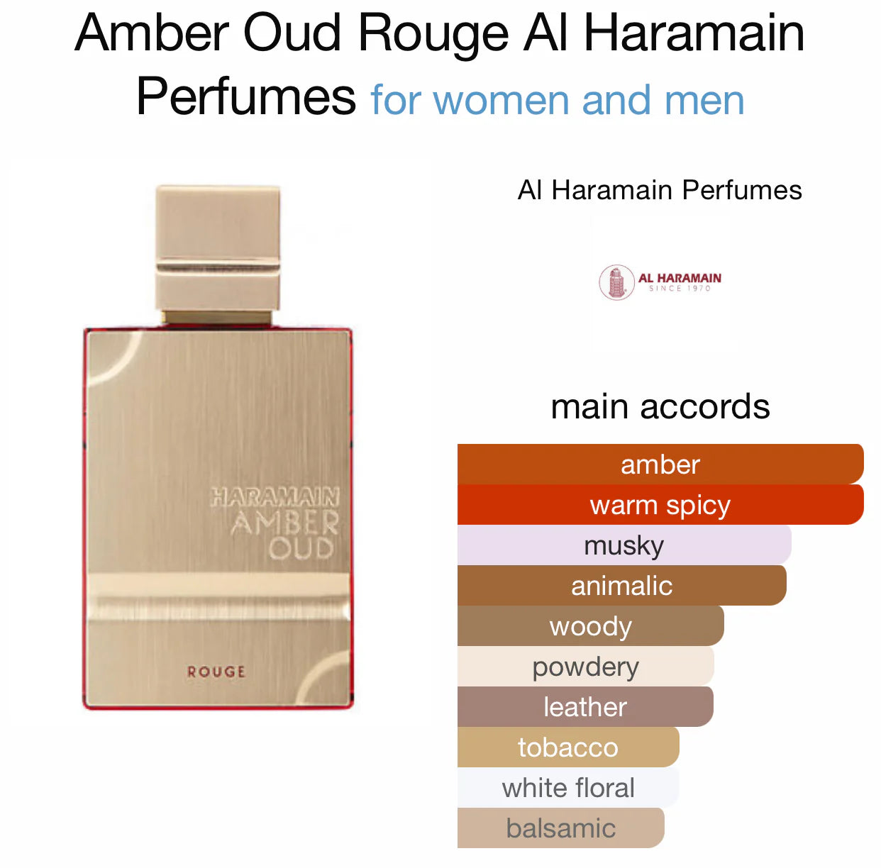 Al Haramain Amber Oud ROUGE is a unisex Eau de Parfum that opens with a captivating blend of saffron and bitter almond, unfolding into a floral-woody heart of jasmine and cedar, and settling into a long-lasting base of ambergris, musk, and soft woods. This rich, warm aroma is inspired by Baccarat Rouge 540 Extrait—perfect for those who desire elegance and projection in one luxurious package.